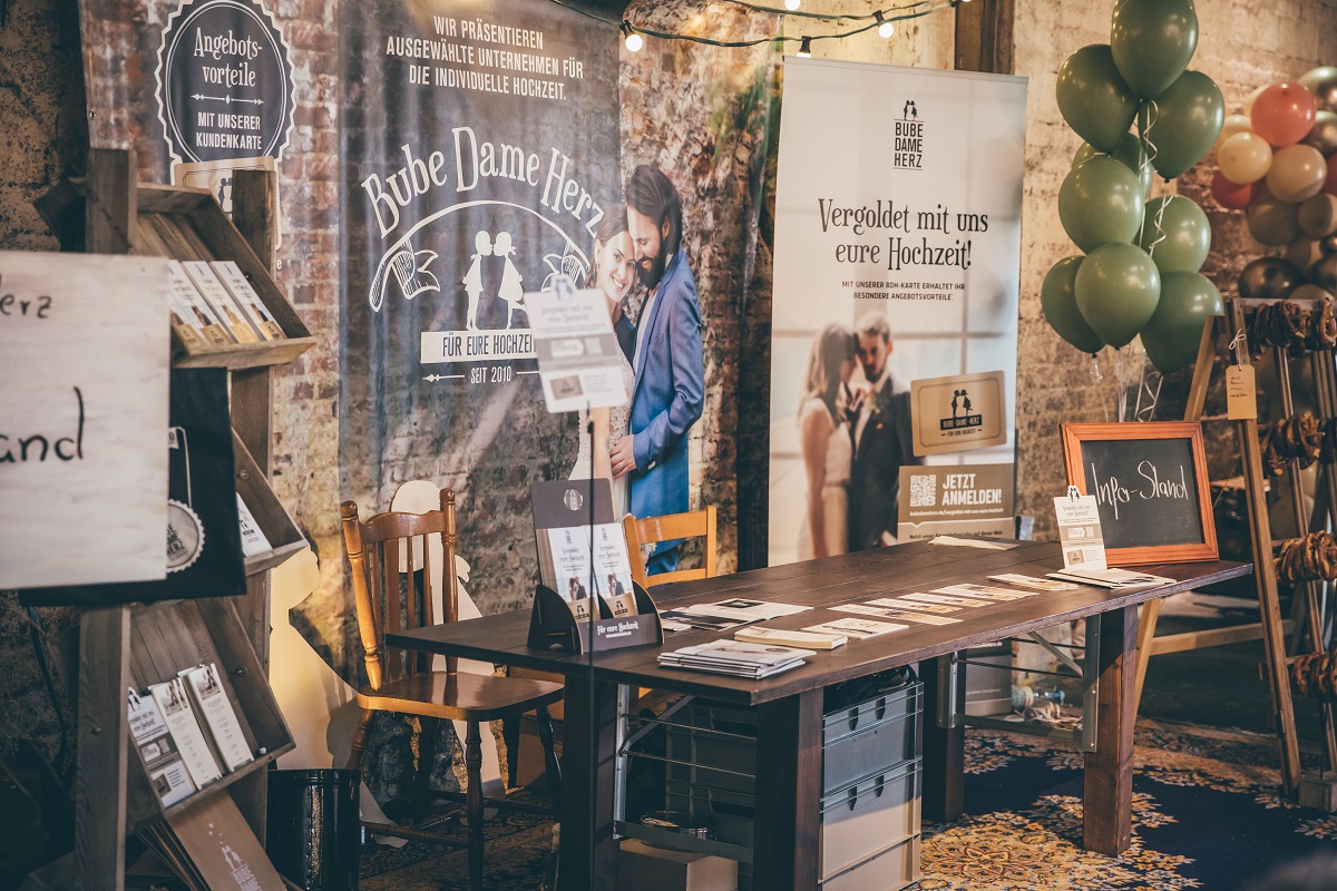 Die Messe Bube Dame Herz in Neuss ist eine regionale Hochzeitsmesse. Verschiedene mit Liebe ausgewählte Aussteller präsentieren sich auf der Bube Dame Herz Messe Neuss mit ihren Produkten, Dienstleistungen, Tipps und Ideen und bieten individuelle Lösungen, die Ihre Hochzeit zu einem unvergesslichen Erlebnis, kurz gesagt, zu einer Traumhochzeit machen. Egal ob klassisch, flippig, schlicht oder extravagant, auf der Hochzeitsmesse Neuss finden zukünftige Brautpaare alles für den schönsten Tag im Leben. Neben Braut- und Herrenmode, Trauringen, Schmuck, Hairstyling und Make-up bietet die Hochzeitsmesse Düsseldorf/Neuss auch Gebäck, Patisserie und Catering, Brautsträuße, Blumendekoration und Kartendesign, sowie Hochzeitsfotografie, Tanzkurse oder auch die gesamte Hochzeitsplanung. Viele tolle Ideen und Inspirationen für das perfekte Hochzeitskleid oder den Anzug für den Bräutigam bietet außerdem die Modenschau, bei der klassische und auch extravagante Hochzeitsmode gezeigt wird. Neben vielen Innovationen und Trends sorgen auf der Hochzeitsmesse Bube Dame Herz in Neuss auch DJ Sets und Live Musik für eine gemütliche Atmosphäre und verschiedene Foodtrucks bieten Kaffee, Crêpes und andere leckere Spezialitäten.